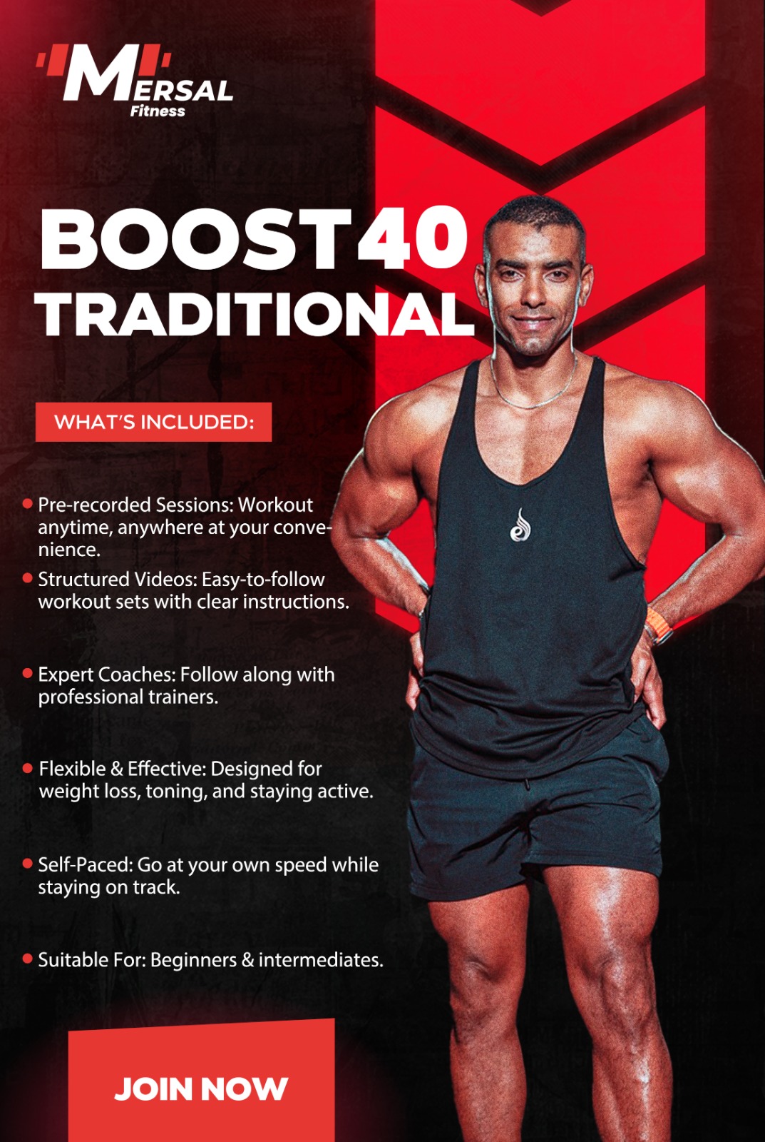 عايز تتحكم في وقت تمرينك وتتمرن من أي مكان؟ و في أي وقت ؟ برنامج Boost40 Traditional هتكون خيارك المثالي! هتلاقي مجموعة تمارين مسجلة بجودة عالية، تقدر تشغلها وقت ما تحب وتتابع مع كابتن مصطفي خطوة بخطوة. كل اللي عليك تبدأ، تتبع الحركات، وتحس بالتغيير الحقيقي يوم بعد يوم.